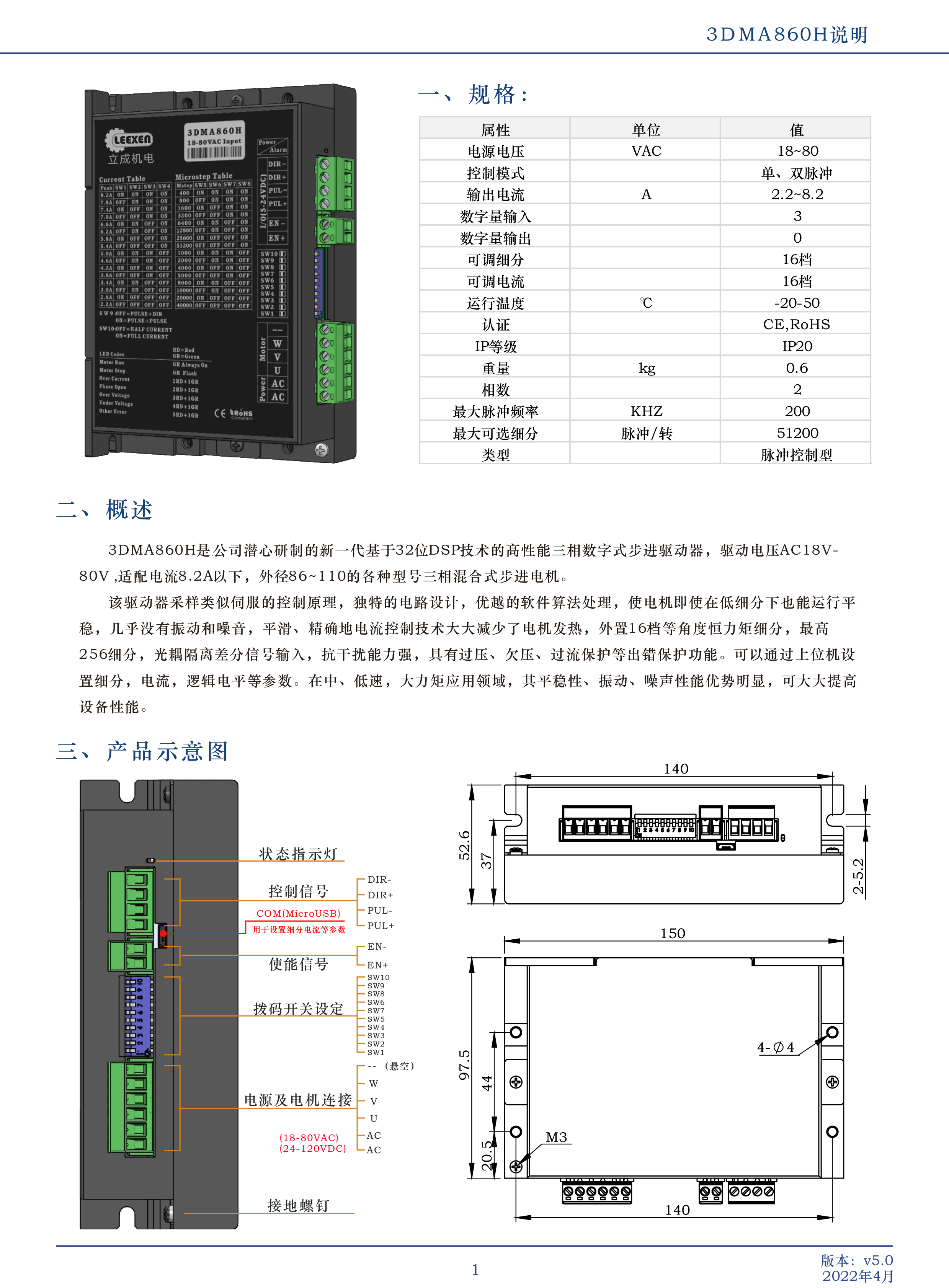 3DMA860H-1型3相開環(huán)步進(jìn)電機(jī)驅(qū)動(dòng)器,是公司潛心研制的新一代基于32位DSP技術(shù)的高性能三相數(shù)字式步進(jìn)驅(qū)動(dòng)器,驅(qū)動(dòng)電壓AC18V80V,適配電流8.2A以下,外徑86~110的各種型號(hào)三相混合式步進(jìn)電機(jī)。