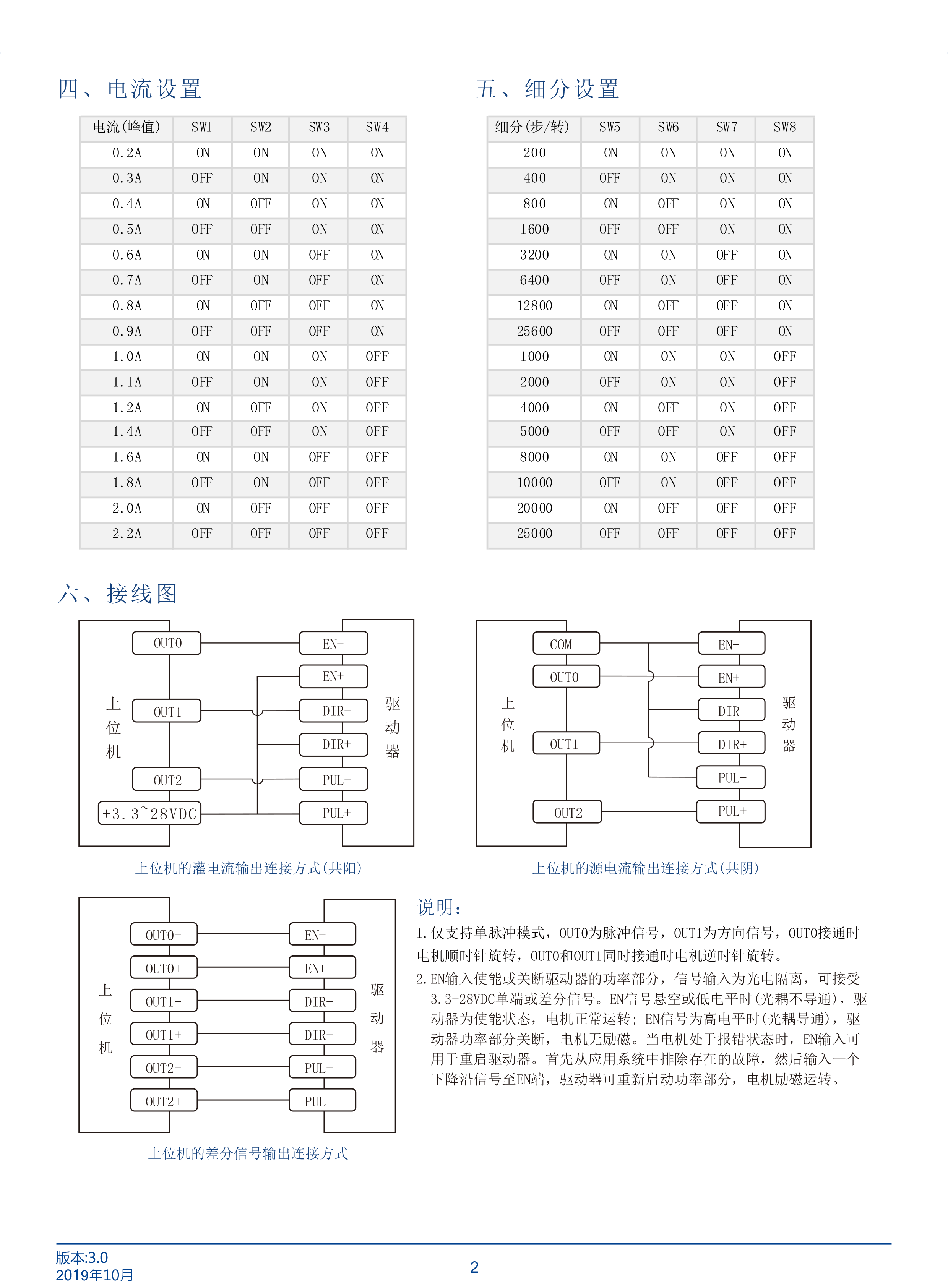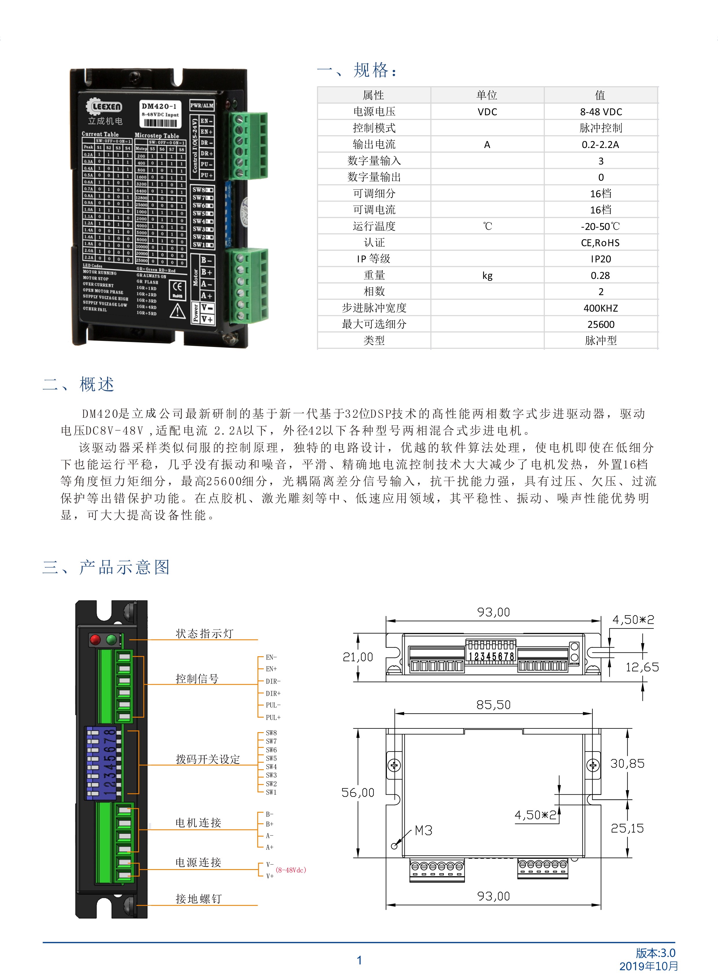 DM420是立成公司最新研制的基于新一代基于32位DSP技術(shù)的高性能兩相數(shù)字式步進(jìn)驅(qū)動器,驅(qū)動電壓DC8V-48V適配電流 2.2A以下,外徑42以下各種型號兩相混合式步進(jìn)電機(jī)。該驅(qū)動器采樣類似伺服的控制原理,獨特的電路設(shè)計,優(yōu)越的軟件算法處理,使電機(jī)即使在低細(xì)分下也能運行平穩(wěn),幾乎沒有振動和噪音,平滑、精確地電流控制技術(shù)大大減少了電機(jī)發(fā)熱,外置16檔等角度恒力矩細(xì)分,最高25600細(xì)分,光耦隔離差分信號輸入,抗干擾能力強(qiáng),具有過壓、欠壓、過流保護(hù)等出錯保護(hù)功能。在點膠機(jī)、激光雕刻等中、低速應(yīng)用領(lǐng)域,其平穩(wěn)性、振動、噪聲性能優(yōu)勢明顯,可大大提高設(shè)備性能。