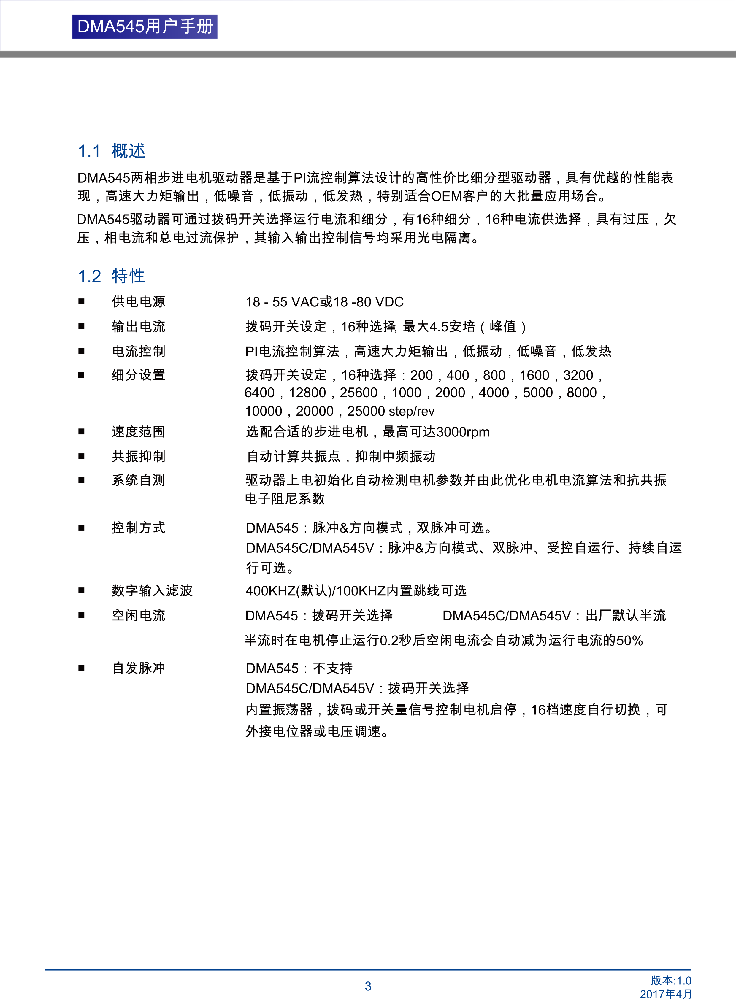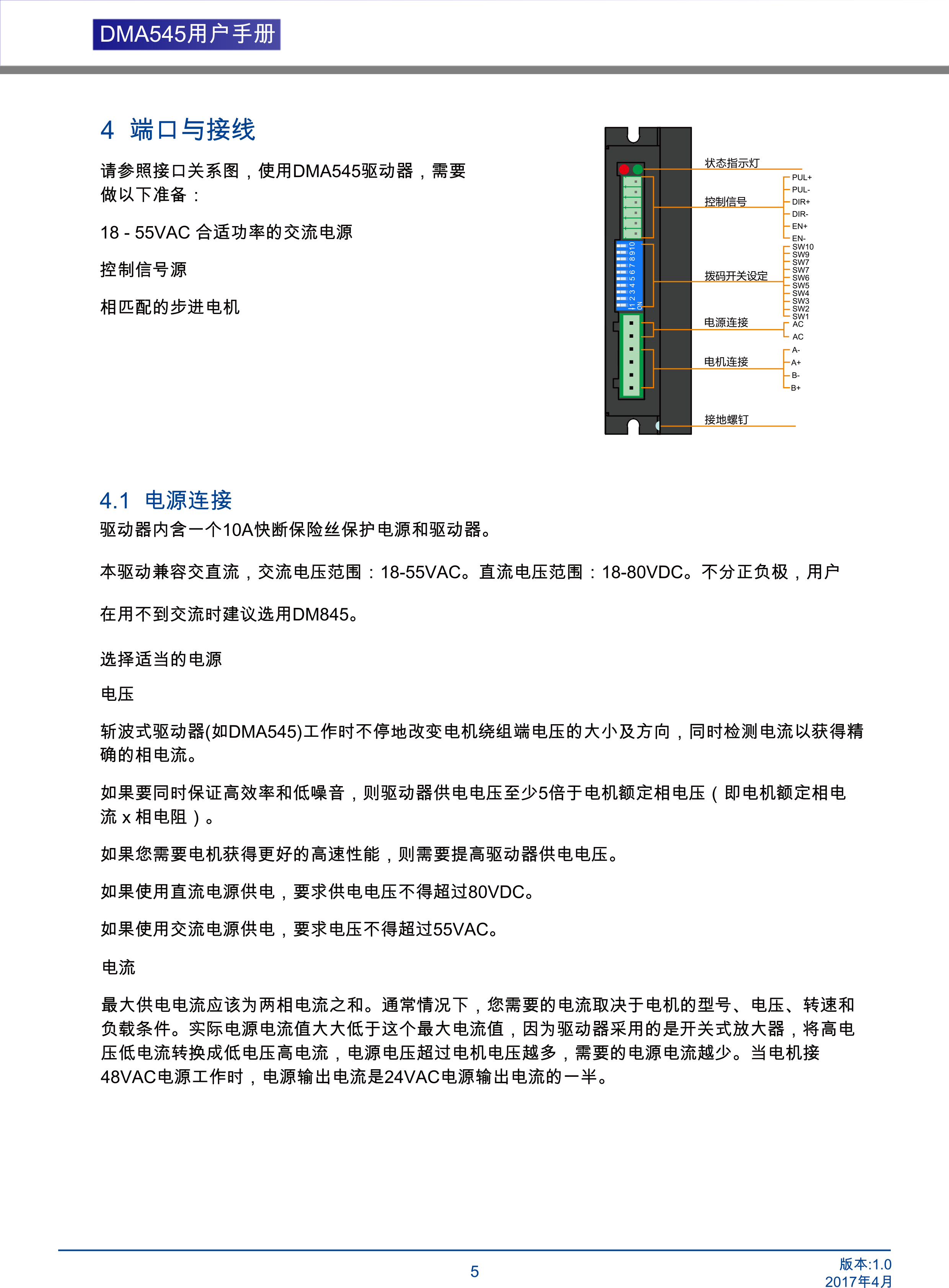 DMA545兩相步進電機驅(qū)動器是基于PI流控制算法設(shè)計的高性價比細分型驅(qū)動器,具有優(yōu)越的性能表現(xiàn),高速大力矩輸出,低噪音,低振動,低發(fā)熱,特別適合OEM客戶的大批量應(yīng)用場合。DMA545驅(qū)動器可通過撥碼開關(guān)選擇運行電流和細分,有16種細分,16種電流供選擇,具有過壓,欠壓,相電流和總電過流保護,其輸入輸出控制信號均采用光電隔離。