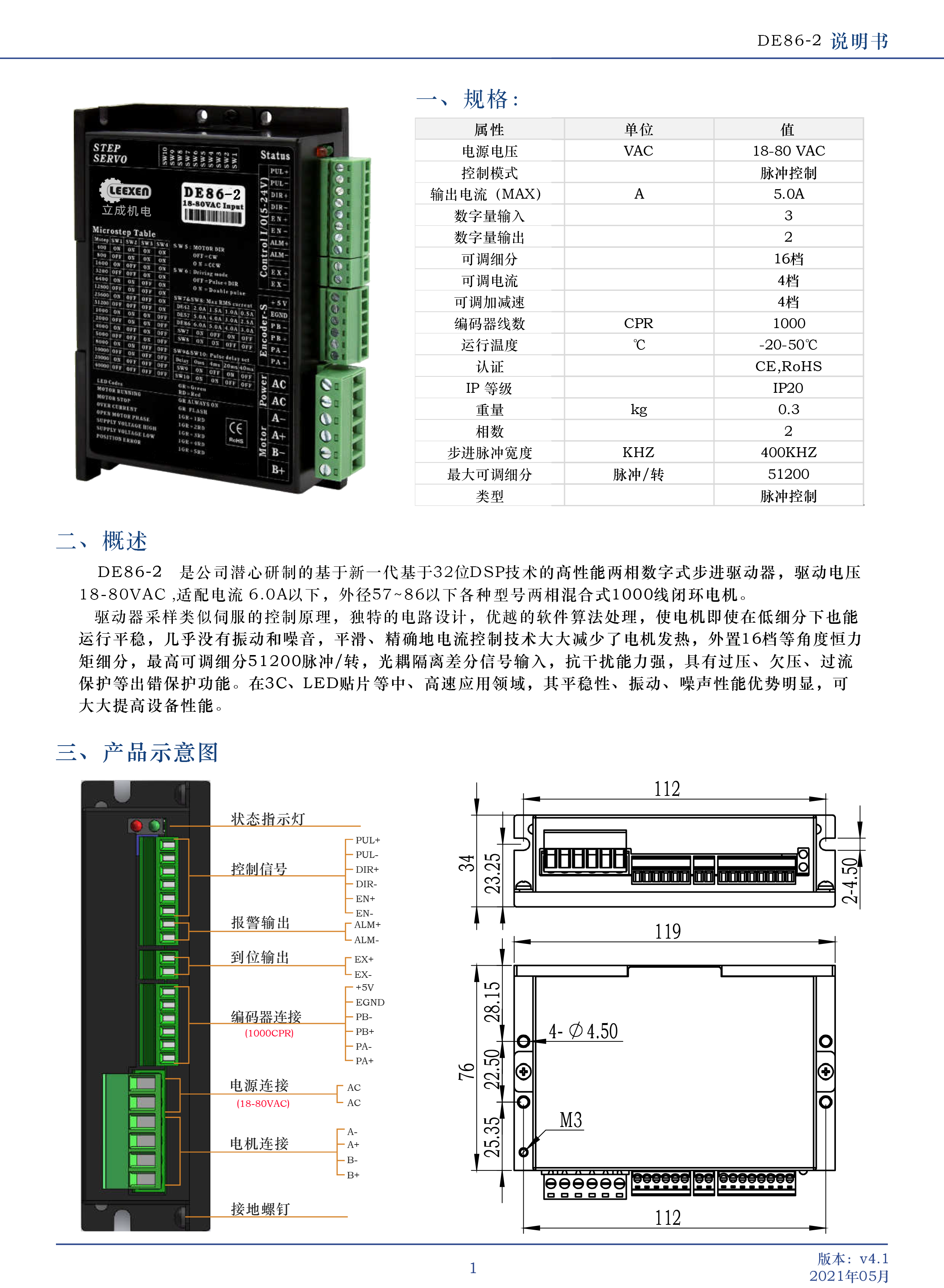 DE86-2 是公司潛心研制的基于新一代基于32位DSP技術的高性能兩相數(shù)字式步進驅(qū)動器,驅(qū)動電壓18-80VAC 適配電流 6.0A以下,外徑57~86以下各種型號兩相混合式1000線閉環(huán)電機。驅(qū)動器采樣類似伺服的控制原理,獨特的電路設計,優(yōu)越的軟件算法處理,使電機即使在低細分下也能運行平穩(wěn),幾乎沒有振動和噪音,平滑、精確地電流控制技術大大減少了電機發(fā)熱,外置16檔等角度恒力矩細分,最高可調(diào)細分51200脈沖/轉(zhuǎn),光耦隔離差分信號輸入,抗干擾能力強,具有過壓、欠壓、過流保護等出錯保護功能。在3C、LED貼片等中、高速應用領域,其平穩(wěn)性、振動、噪聲性能優(yōu)勢明顯,可大大提高設備性能。