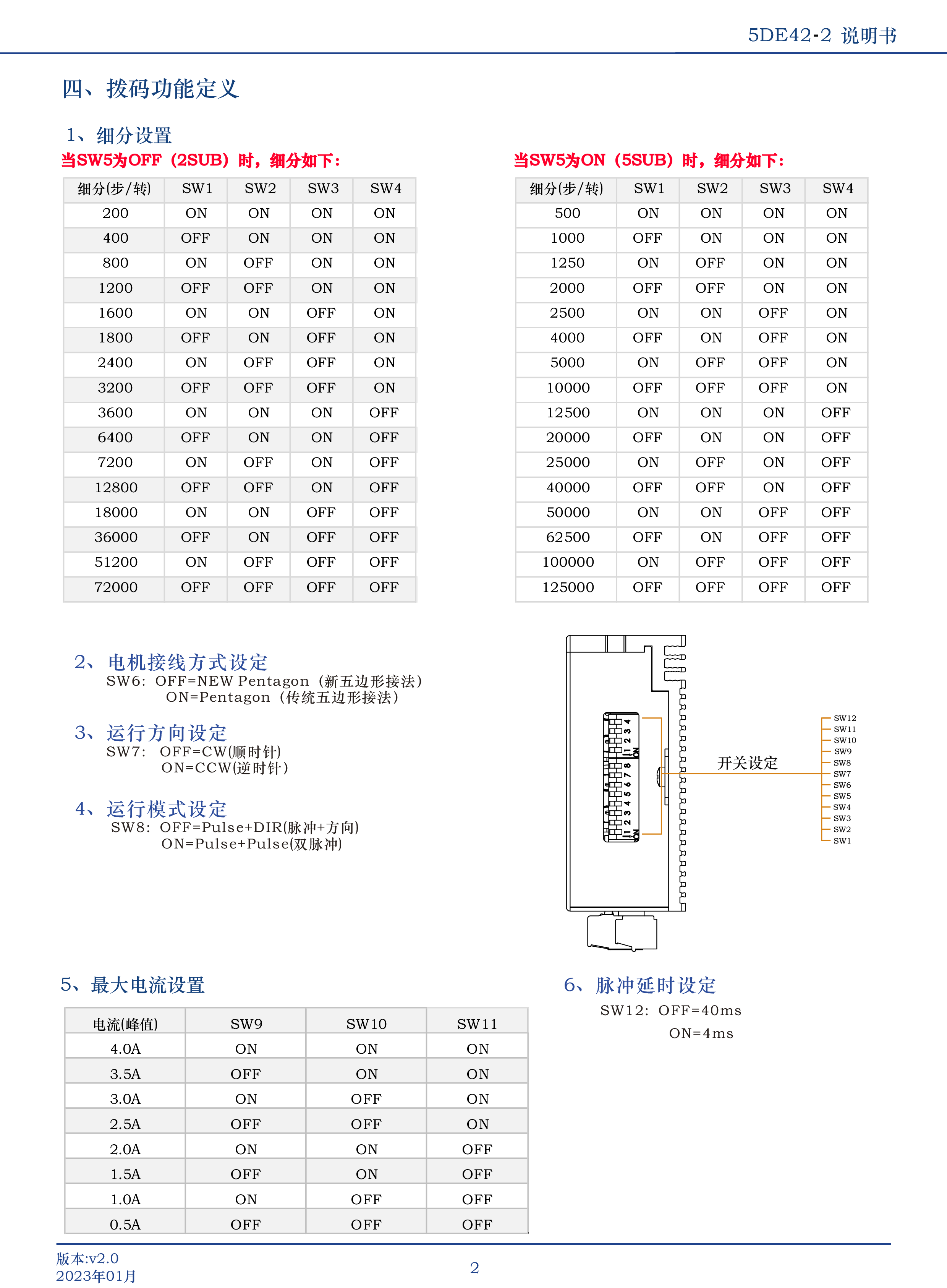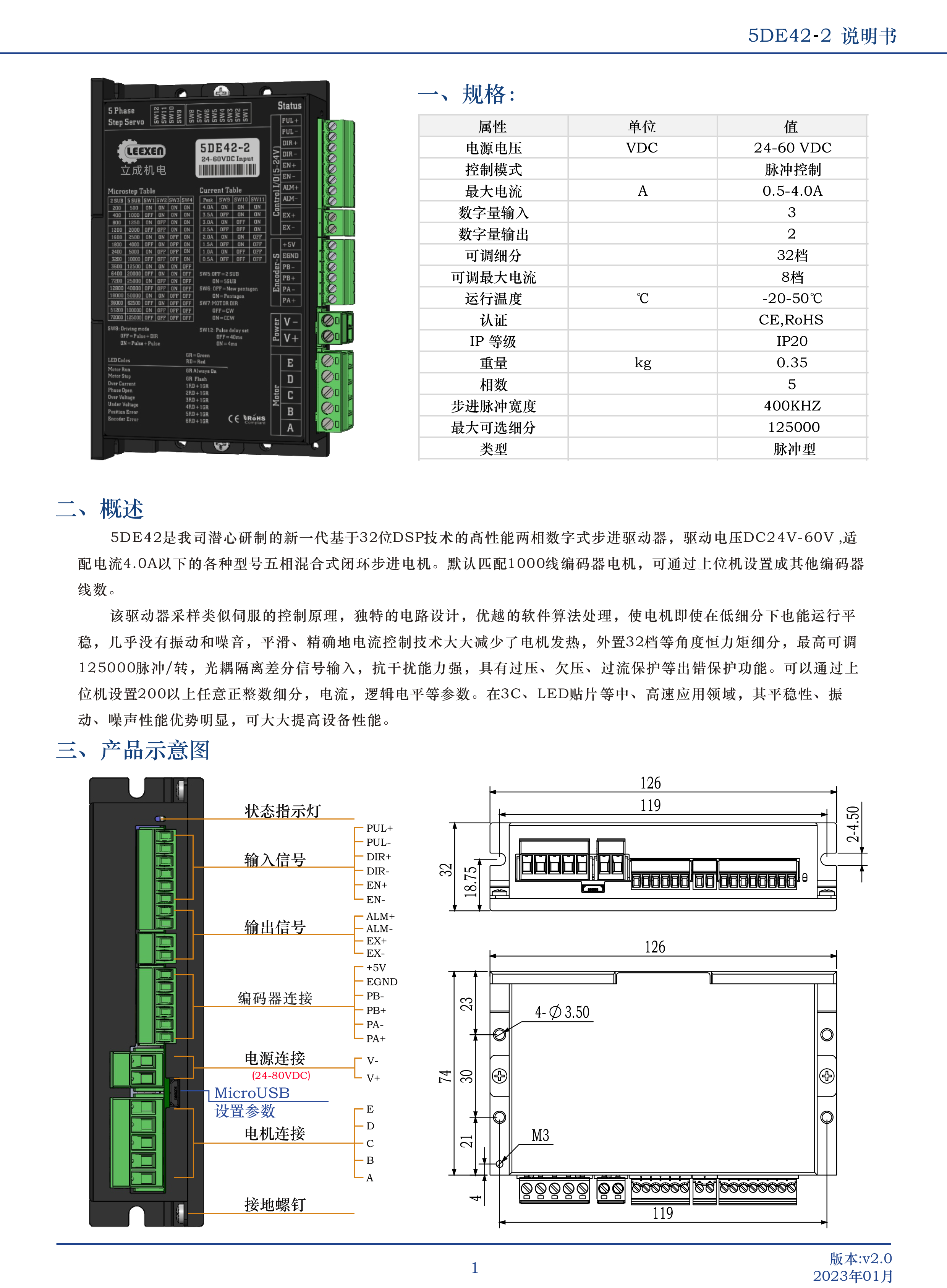 5DE42-2是我司潛心研制的新一代基于32位DSP技術(shù)的高性能兩相數(shù)字式步進(jìn)驅(qū)動(dòng)器,驅(qū)動(dòng)電壓DC24V-60V,適配電流4.0A以下的各種型號(hào)五相混合式閉環(huán)步進(jìn)電機(jī)。默認(rèn)匹配1000線編碼器電機(jī),可通過(guò)上位機(jī)設(shè)置成其他編碼器線數(shù)。該驅(qū)動(dòng)器采樣類(lèi)似伺服的控制原理,獨(dú)特的電路設(shè)計(jì),優(yōu)越的軟件算法處理,使電機(jī)即使在低細(xì)分下也能運(yùn)行平穩(wěn),幾乎沒(méi)有振動(dòng)和噪音,平滑、精確地電流控制技術(shù)大大減少了電機(jī)發(fā)熱,外置32檔等角度恒力矩細(xì)分,最高可調(diào)125000脈沖/轉(zhuǎn),光耦隔離差分信號(hào)輸入,抗干擾能力強(qiáng),具有過(guò)壓、欠壓、過(guò)流保護(hù)等出錯(cuò)保護(hù)功能。可以通過(guò)上位機(jī)設(shè)置200以上任意正整數(shù)細(xì)分,電流,邏輯電平等參數(shù)。在3C、LED貼片等中、高速應(yīng)用領(lǐng)域,其平穩(wěn)性、振動(dòng)、噪聲性能優(yōu)勢(shì)明顯,可大大提高設(shè)備性能。